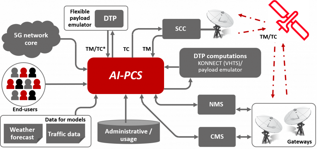 The AI-PCS system interacts with the module in charge of the on board computations, providing feedback to the satellite control center (SCC), to reconfigure the payload through telecommands (TC). Once the payload is reconfigured, the gateways need to be provided with this information. When operating with the payload emulator instead of the real satellite, the AI-PCS prototype will be able to interact directly with the emulator, without the use of the SCC, through TM/TC, which are pseudo-TM/TC commands.